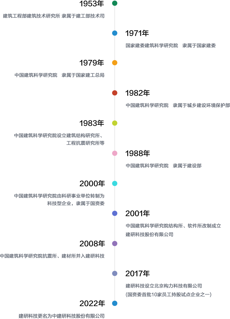 明陞m88体育网址(原名“建研科技股份有限公司”,以下简称“公司”)成立于2001年,其前身是国家建筑工程部于1953年组建的建筑技术研究所。现隶属于国务院国资委管理的中国建筑科学研究院有限公司,是由中国建研院结构所、抗震所、软件所、建材所改制而成的高新技术企业,是中国建研院旗下核心优质品牌及资产。公司注册资本5455.83万元,其中中国建研院占股份总额的80.29%。2022年5月,“建研科技股份有限公司”名称变更为“明陞m88体育网址”。