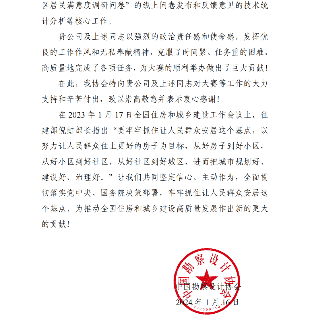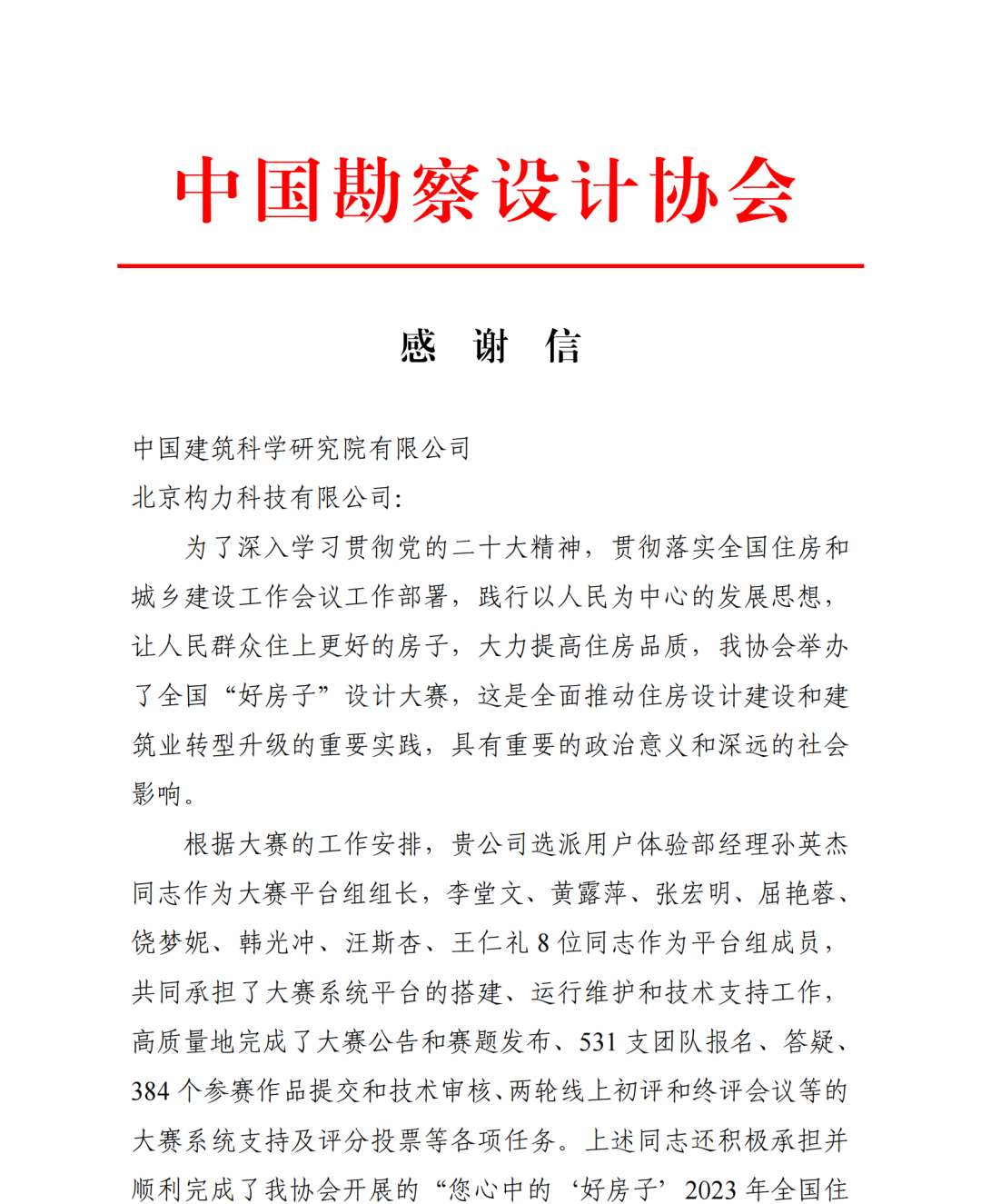 2024年1月16日,明陞m88体育网址所属北京构力科技有限公司(以下简称“构力科技”)收到中国勘察设计协会发来的感谢信,对构力科技承担的大赛系统平台的搭建、运行维护及技术支持等工作表示感谢。