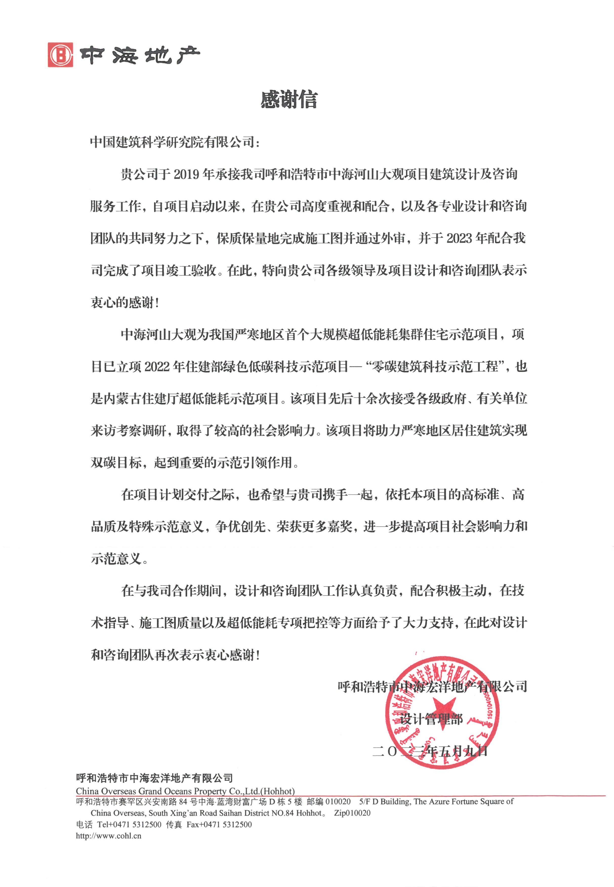 近期,中国建研院收到来自呼和浩特市中海宏洋地产有限公司的感谢信。信中表示,目前“呼和浩特市中海河山大观项目”已经顺利完成了项目竣工验收,对中国建研院在项目建设过程中提供的设计与咨询服务以及团队的精湛技术表示感谢。