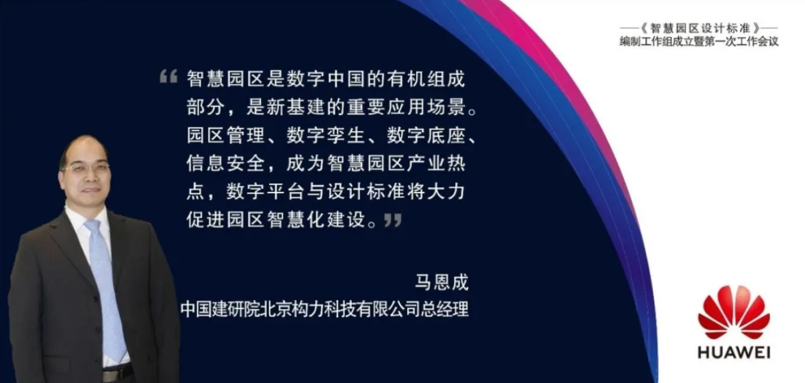 会上,北京构力科技有限公司马恩成总经理、华为智慧园区业务部总裁苏宝华博士分别代表主编单位进行了主题报告;在《智慧园区产业热点介绍》中,马恩成总经理从园区管理智慧化支撑及智慧园区促进建筑业数字化转型的角度介绍了智慧园区的产业热点,指出智慧园区未来发展对于“数字平台”和“设计标准”的需求,介绍了华为与构力为建筑行业共同打造的集5G、云、AI、BIM等新信息技术的BIM使能平台,通过“标准+平台+生态”的形式,为智慧园区的未来发展打造一个繁荣的开发者生态,为数字中国奠定基础。