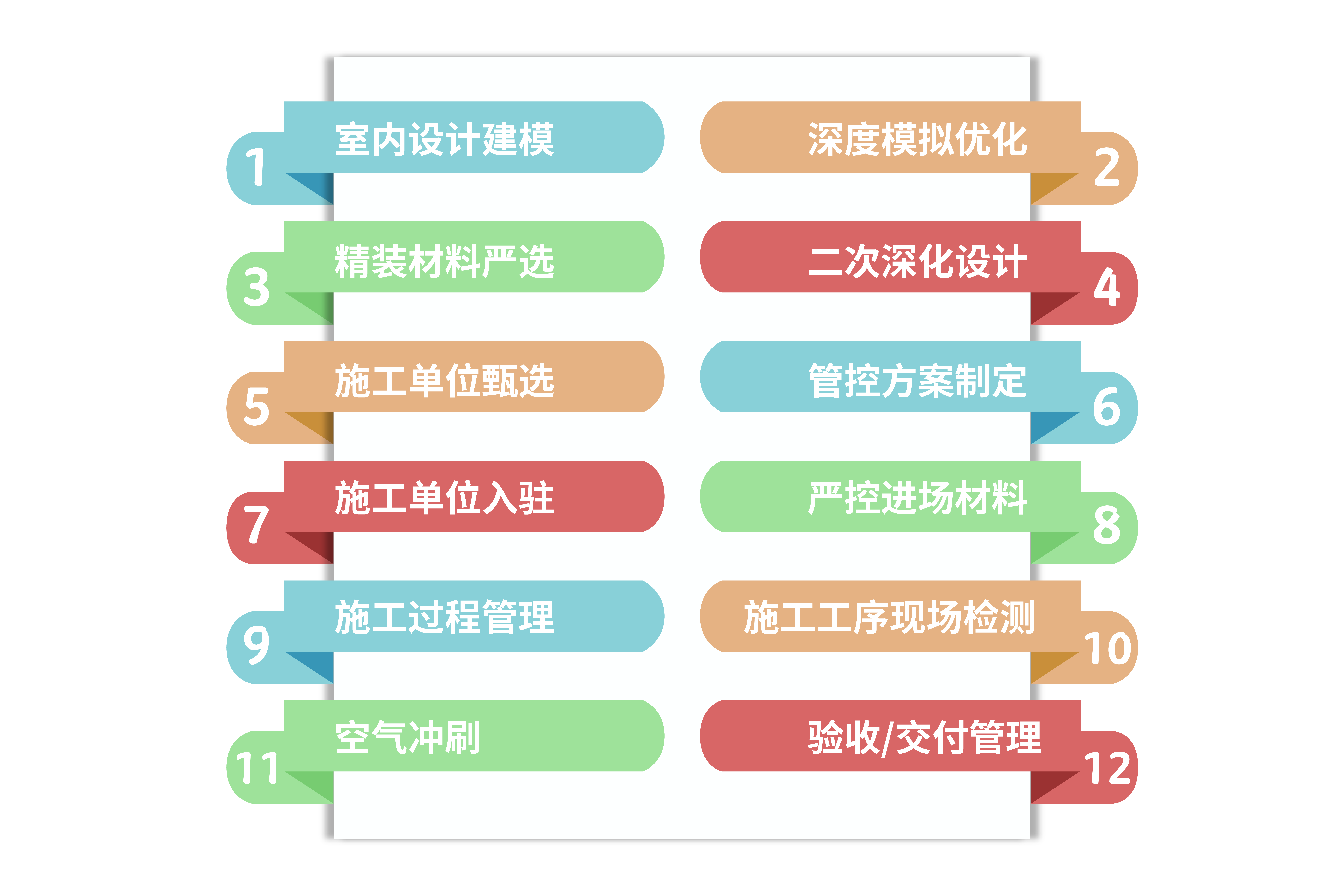 整个无污染精装管控体系共分为以下十二个管控步骤,涵盖了整个项目从方案设计到最终交付的全过程,全面管控,注重细节,层层把关,步步为营。