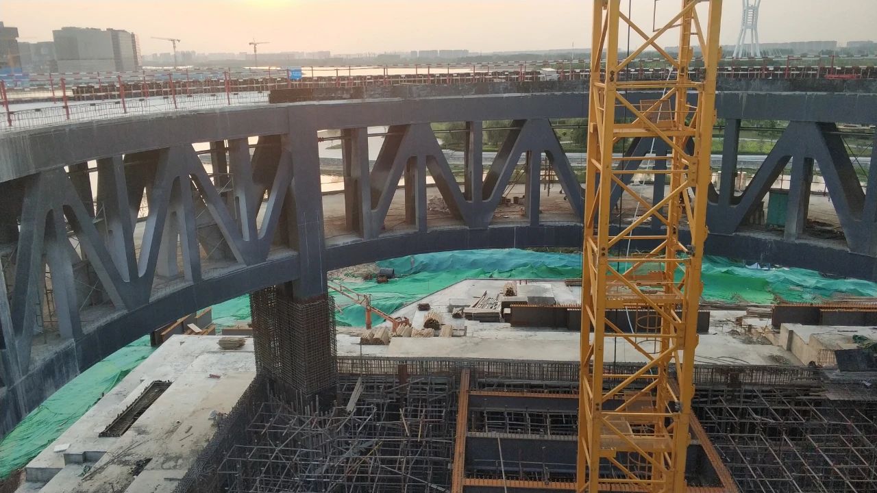 我们的工程师经过多方案对比,最终选择采用空间钢结构来实现观景环廊。在内环设置约1.5米宽、5.9米高的环形空间钢桁架,钢桁架下设三个支点,与下部混凝土结构相连。支点处的桁架竖腹杆加粗,直接深入下部混凝土结构当中,既保证了支座的安全性,又将钢结构的支点巧妙的“藏”了起来,轻松实现漂浮感。环形空间钢桁架分约36节,根据建筑布置基本均分网格。桁架外侧设辐射状钢梁悬挑近8.5米,辐射状钢梁间设次梁,铺设钢筋混凝土板。