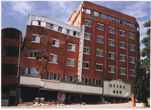 图3 1999台湾地震,南投县埔里大饭店,7层框架,底层大空间,基本无填充墙,地震中底层破坏严重