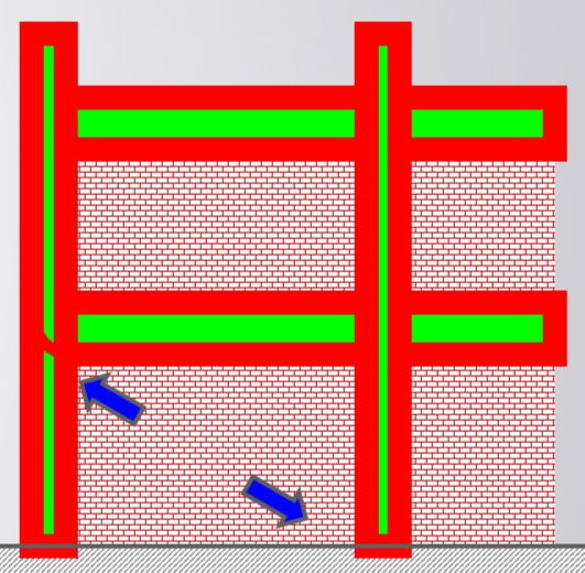 (5) 增加建筑物吸收和耗散地震能量的能力,提高整个建筑的抗震能力。1985年墨西哥地震,墨西哥市一些纯框架高层建筑发生倒塌,而带有砖填充墙的框架结构高层建筑,不但没有倒塌,而且破坏程度较轻。很大程度上因为刚性填充墙通过自身的变形及墙面裂缝的出现和开展,消耗了大量输入建筑物的地震能量,保护了主体结构,从而提升了建筑的抗震安全性能。