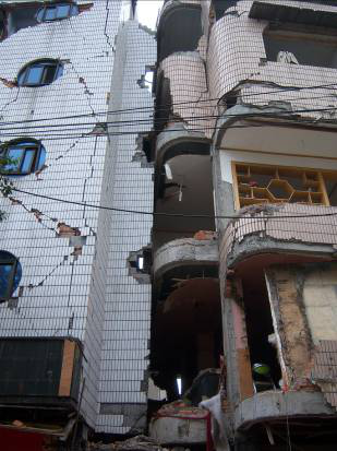 图1 2008年汶川地震,相邻建筑的碰撞破坏实例(1)