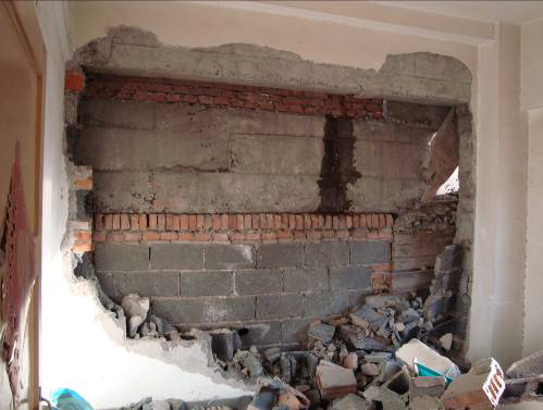 (a) 防震缝宽度不够,高低建筑相互碰撞造成墙体破坏
