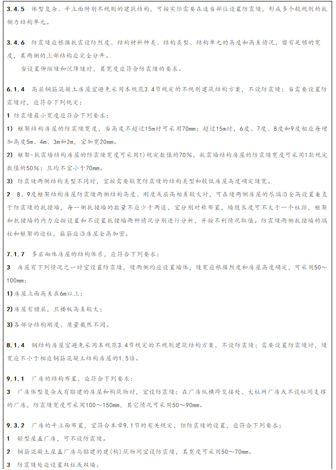 我国的10规范(《建筑抗震设计规范》GB 50011-2010)在第3.4.5条给出了防震缝设置的一般规定,同时,在第6.1.4条、7.1.7条、8.1.4条、9.1.1条和9.3.2条等处分别对钢筋混凝土房屋、砌体结构房屋、钢结构房屋、钢筋混凝土厂房以及单层砖柱厂房等防震缝设置进行了规定。