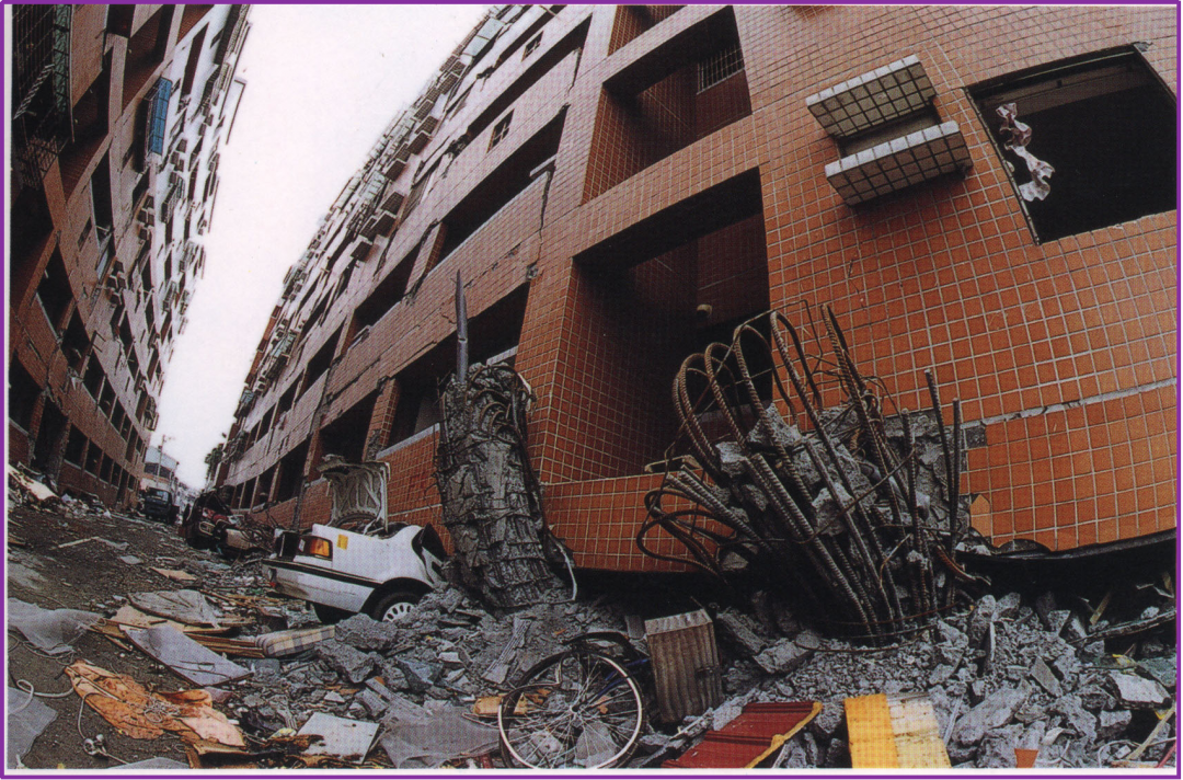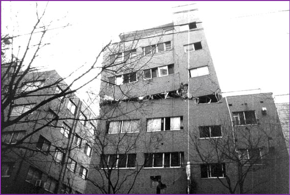 带薄弱楼层的多层和高层建筑,变形集中往往会导致薄弱楼层的严重破坏或倒塌。1995年,日本阪神地震中,大量劲型混凝土高层建筑,底部劲型混凝土结构与上部普通钢筋混凝土结构的过渡楼层因为侧向刚度、强度突变形成薄弱楼层。地震时,过渡楼层塑性变形集中,导致层间侧向位移过大,出现大量过渡层倒塌现象(图4)。
