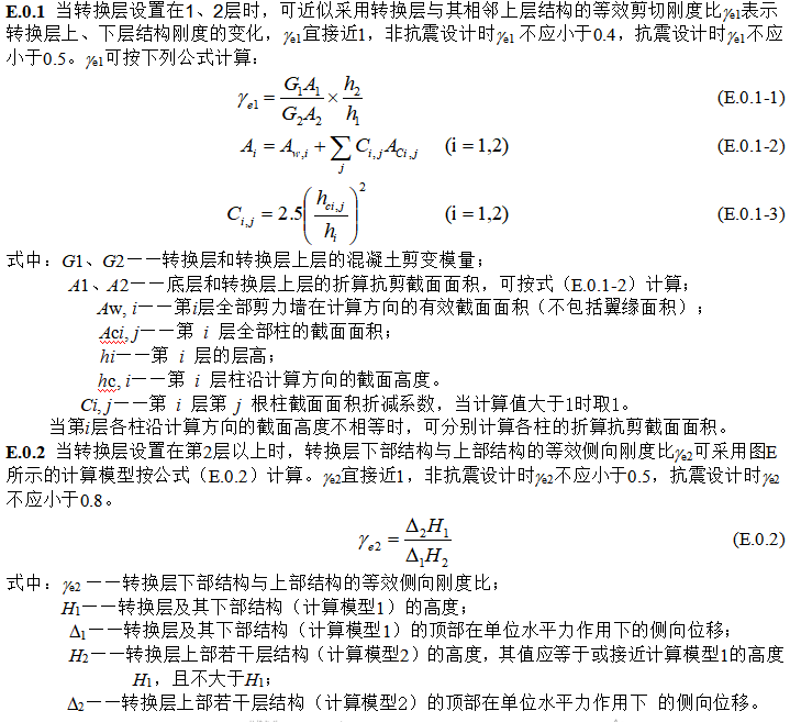 图E 转换层上、下等效侧向刚度计算模型 E.0.3 当转换层设置在第2层以上时,按本规程(3.5.2-1)式计算的转换层与其相邻上层的侧向刚度比尚不应小于0.6。 |