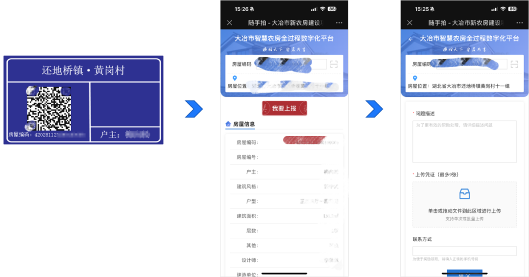 监管系统数据库可与对应部门数据库充分对接,为每栋房屋生成专属的二维码房牌,实现线上线下一体化管理,为农房安全常态化巡查和定期体检提供了数据和系统支持。农户和相关管理人员可通过扫描二维码上报房屋安全问题,实现农房安全监管“人人参与”。将农户自查、镇村排查、县级巡查、执法检查,以及群众监督相结合,能够及时发现并采取有效措施消除安全隐患。