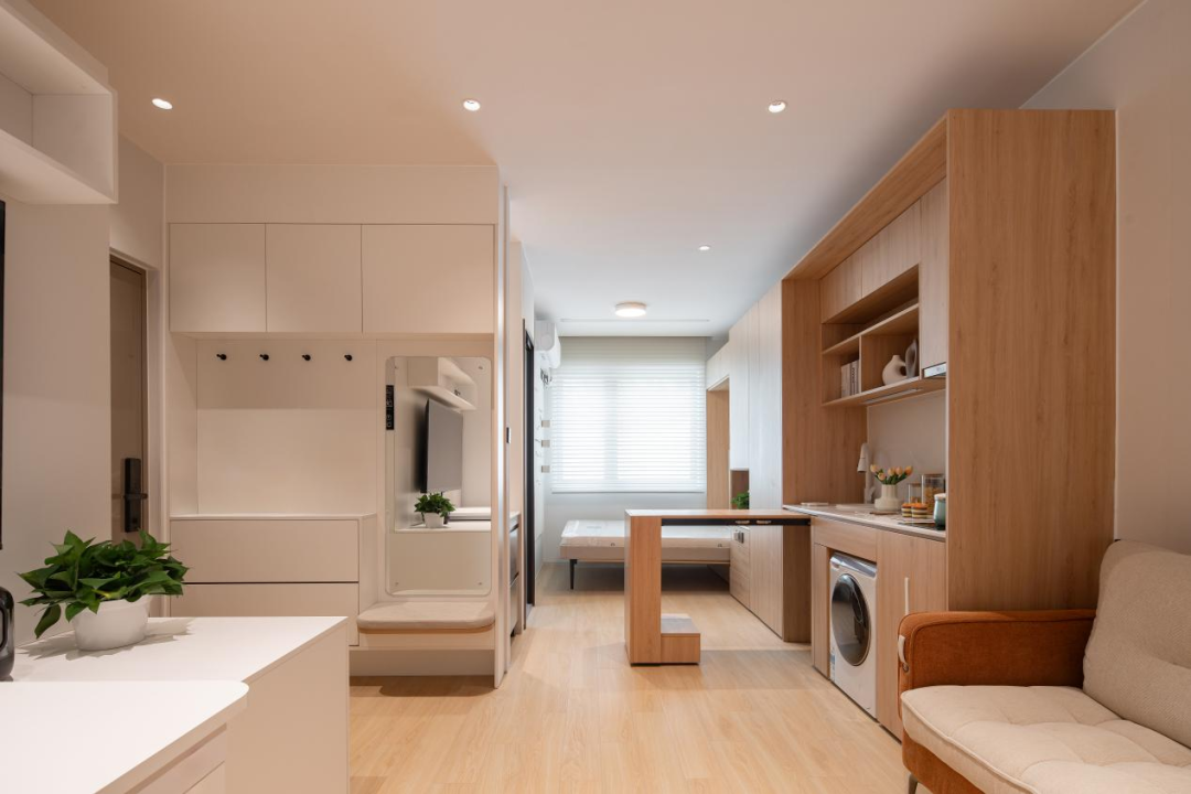 在设计理念上,该项目以“安全、舒适、绿色、智慧”四大体系为核心,致力于打造高品质住房示范样板。设计团队从建筑既有户型出发,精心规划了四种户型,以折叠空间为户内空间主体概念,通过可变家具实现灵活可变及空间功能的复合使用。每一种户型设计都精准洞察并贴心回应了未来生活方式。