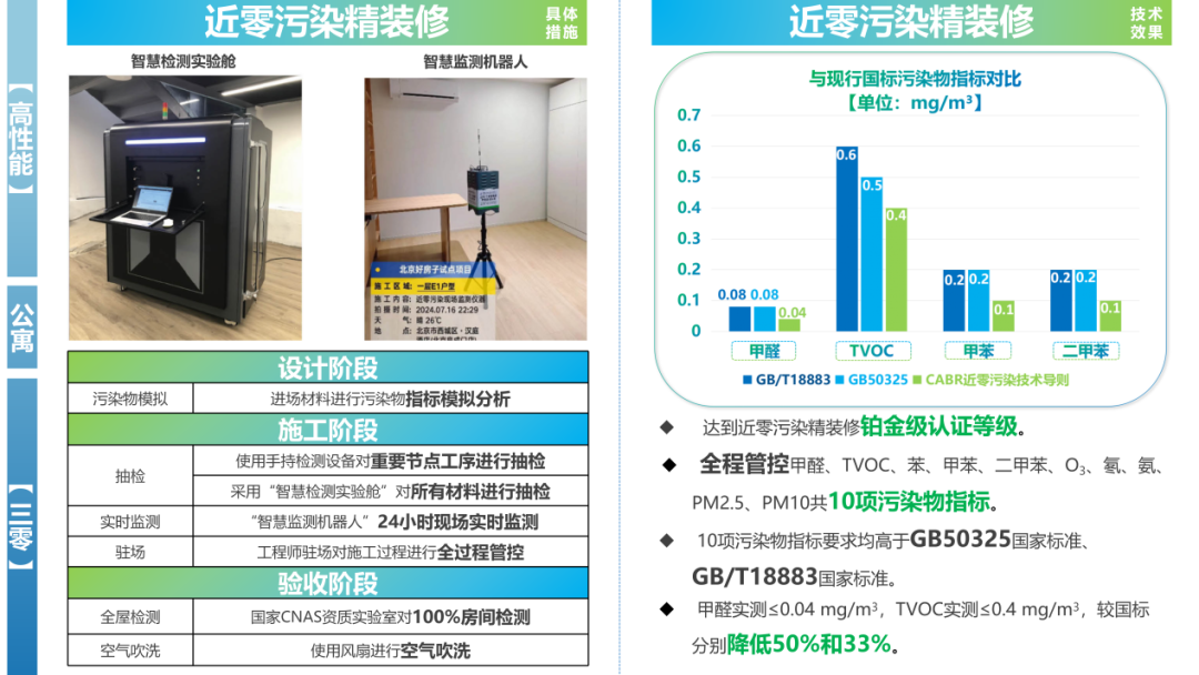 在近零污染精装修方面,项目开发贯彻精装修过程全生命周期的解决方案,在设计、施工、运营阶段对室内污染物进行模拟计算、现场管控和持续监测。以中国建研院近零污染精装修技术导则为标准,通过模拟分析装修材料中甲醛、TVOC等污染物挥发情况选材,在工程现场放置空气检测舱检测及抽检进场材料,使用智慧监测机器人进行指标监测,全屋检测验收确保室内空气性能指标符合要求,实现交付即入住,为住户提供高品质室内空气质量。