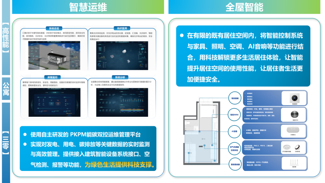 此外,项目还使用自主研发的PKPM能碳双控运维管理平台,实现对发电、用电、碳排放等关键数据的实时监测与高效管理,提供接入建筑智能设备系统接口、空气检测、报警等功能,为绿色生活提供科技支撑。