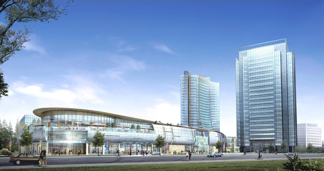 项目周边有较多的绿化和水体,设计的宗旨是如何引入自然因素,将其和综合体室内外空间结合在在一起。高层塔楼布置在南边,一方面解决了日照阴影的问题,更重要的是在西南的交通枢纽处建立地标建筑,办公楼设置在西南为一单栋建筑,这样有利于提升该办公楼的形象,和运营上的灵活性。弧线外形的酒店设置在远离主干道一侧有利于提供更私密和单独出入囗,而提高标淮和档次。商业裙房部份在西侧为弧线设计,一方面和自然水体环境相呼应,另一方面拉长了商业部份的立面,而带来更多的商业曝光面,在商业裙房的东侧为四季中庭,该设计的目的是提供一个有独特建筑语言的文化,餐饮环境,一个似乎室外具有充足采光而又兼有人工调控和适用于任何气候条件下的场所。