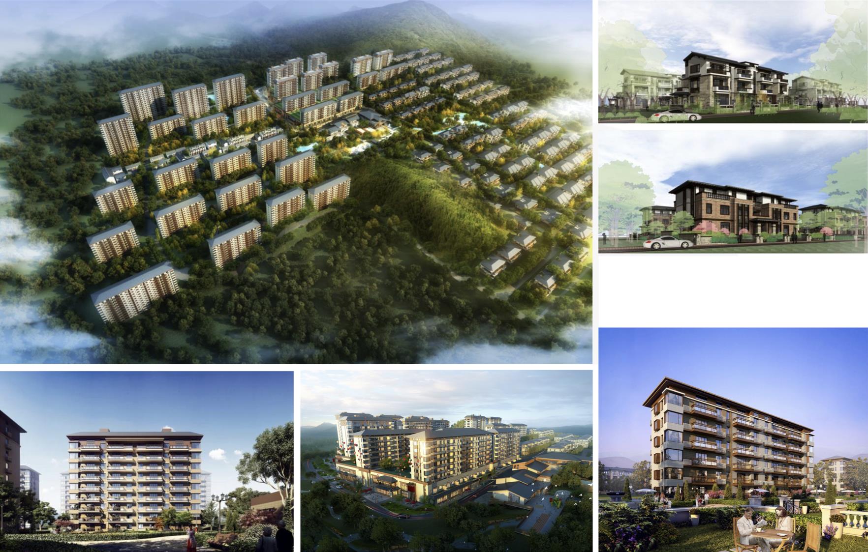 本项目占地面积52300平方米,约78亩,新建住宅建筑28栋,红线范围内西低东高,北高南低,然高差约16米。根据建筑类型,将场地划分为西侧洋房区和东侧双拼区,洋房区依据地势划分为69米和74米两个平台,平台内釆用院落式的布局形式,形成若干组团,组团内部营造温馨静谧的小环境,给住户带来领域感和安全感,给邻里交往和户外活动提供良好的空间,非常符合现代人交流的心理需要。组团之间形成开阔的视觉通廊,可观赏整个区域的美丽景致;双拼区依据地势自北向南,自西向东,建筑沿宅间小路相互错落,层层跌落,构造出丰富多样的空间关系和富有变化的天际线。