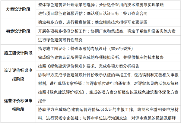随即开展的绿色建筑咨询工作将与项目的设计工作进程紧密结合。在方案设计阶段将与业主展开广泛交流以确定绿色建筑整体方案,如建筑冷热源方案,可再生能源建筑利用方案等。在初步设计、扩初设计及施工图设计阶段中,咨询团队将与业主及设计单位紧密合作,以确保绿色建筑整体方案落到实处。