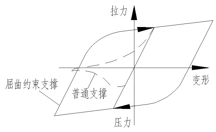 屈曲约束支撑仅芯板与其他构件连接,所受的全部荷载由芯板承担,约束外套筒和无粘结填充材料仅约束芯板受压屈曲,使得芯板在受拉和受压下均能进入屈服,因而其滞回性能优良