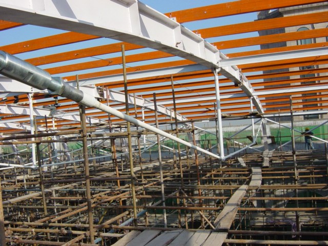 屋顶弦支网壳设计-施工一体化。结构大厅平面投影为圆形,直径约50m的圆形屋顶。因建筑上要求屋盖特别扁平,矢跨比仅为1/10,且下部设有走道、电梯井筒、防火帷幕等,布置十分复杂。为满足建筑要求,经过分析、论证,最后采用“外环双层网壳+内部弦支穹顶”的杂交结构,不仅满足了建筑功能而且结构受力十分合理,因索的引入结构显得特别轻巧、简洁。
