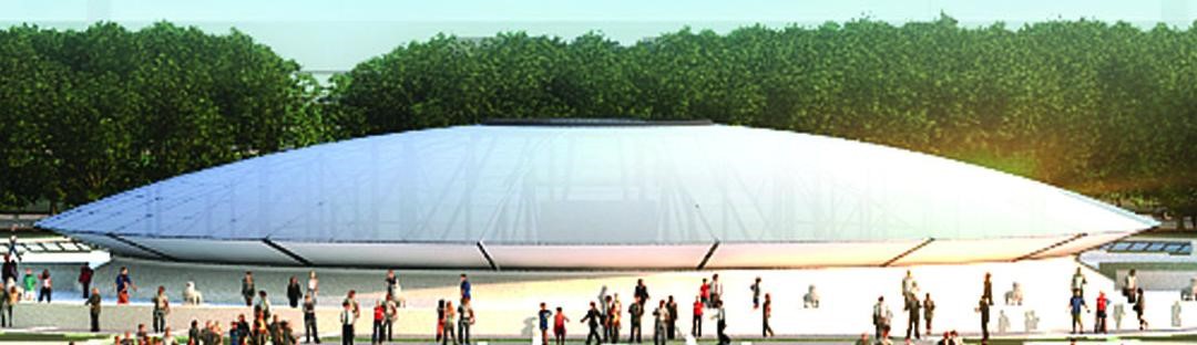 张弦屋盖深化设计及施工。屋盖平面投影39.0m×25.3m,采用两点支撑的张弦结构。张弦屋盖,张弦跨度25.3m,间距5m,上弦截面为H型钢,拉索直径为Φ60。