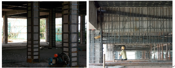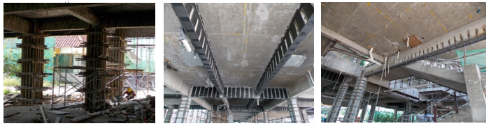 改造涉及5个单体建筑,总建筑面积约1.8万㎡;加固形式涵盖粘贴钢板加固、粘贴碳纤维布加固、增大截面加固、预应力拔柱加固、洞口调整等。