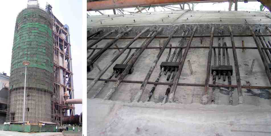 筒仓高58m,外径23m,壁厚380mm,采用环向配置预应力筋,环、竖向配置单层钢筋网的混凝土叠合层法进行加固。
